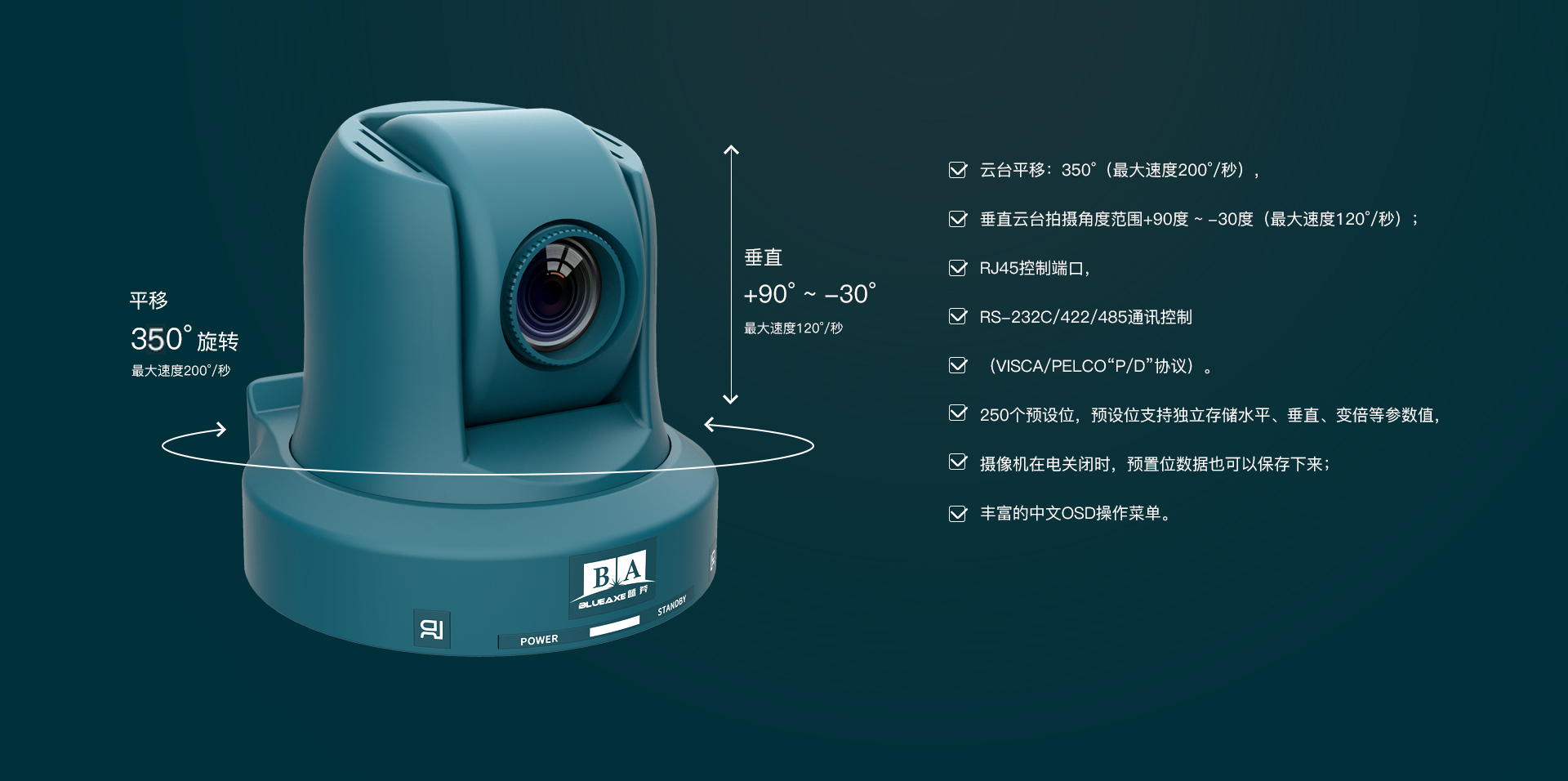 国产品牌,采用全新的超静音传动云台一体结构设计,传动运行几乎无声音,提供超高清晰4K超清晰视频画质图像,采用1/2.5英寸传感器,最大支持4K输出,30倍光学变焦,851万像素;支持两路3G-SDI、HDMI、IP等,广泛适用于国防会议建设、大型会场、应急指挥室、教堂、礼堂、集团会议、政企单位等。可输出超清4K图像,3840X2160P分辨率,并实现云台平稳的摇移、俯仰操作和大范围区域内的物体拍摄,而扰动却很小。自动聚焦/ 自动曝光,支持外部设备RS232或RS485控制,支持远程控制等等便捷的功能。 具备HDMI超清视频信号输出,支持H.264、H.265信号控制和视频输出,提供高清晰和高分辨率的图像质量,HD视频下所有高清接口可以同时输出,RJ45接口,中文操作菜单。 4K分辨率3840X2160P,HD分辨率1080P,1080i,720P多种格式。