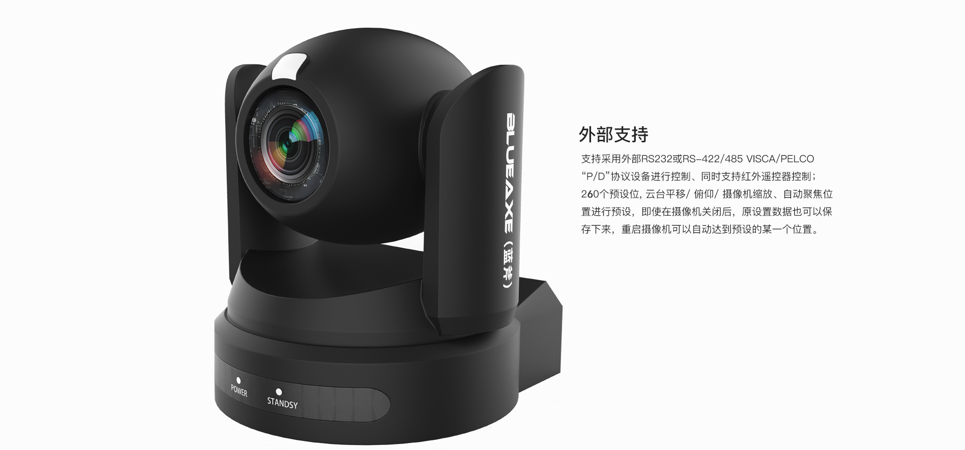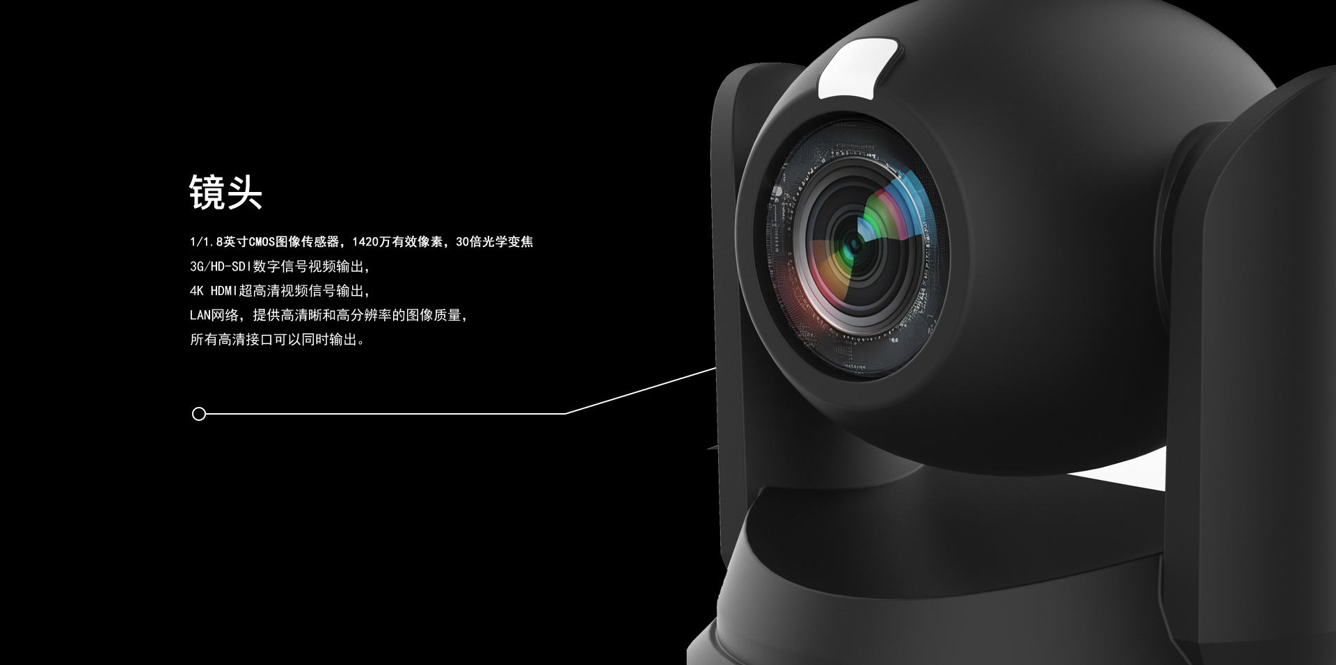 国产品牌;30倍光学变焦;1/1.8英寸 CMOS图像传感器,最大支持4K图像(3840×2160)输出,1420万有效像素; 支持4K、1080p/60、1080p/50、1080p/30、1080p/25、720p/60、720p/50等分辨率; 支持H.264、H.265视频压缩,支持高达 1920×1080分辨率 60 帧/秒压缩,支持 ONVIF、RTSP; 视频输出口:2路6G-SDI输出 、一路HDMI、一路IP网口,所有高清视频同时输出; 满足1080p/60fps高清SDI信号长距离(不低于80米)无衰减传输;SDI远距离传输真正无损传输;支持1路RS-485/RS-232、1路IP网络、红外遥控控制,支持标准ONVIF协议、网络VISCA协议、PELCO P D协议;支持自动/手动白平衡、自动/手动光圈、自动/手动曝光、图像电子翻转、自动/手动聚焦,背光补偿等功能。超静音云台,低速运行平稳,超静音,水平转动±170 度,俯仰转动-30 度~+90度,控制速度水平最快200°/秒、俯仰最快100°/秒。
